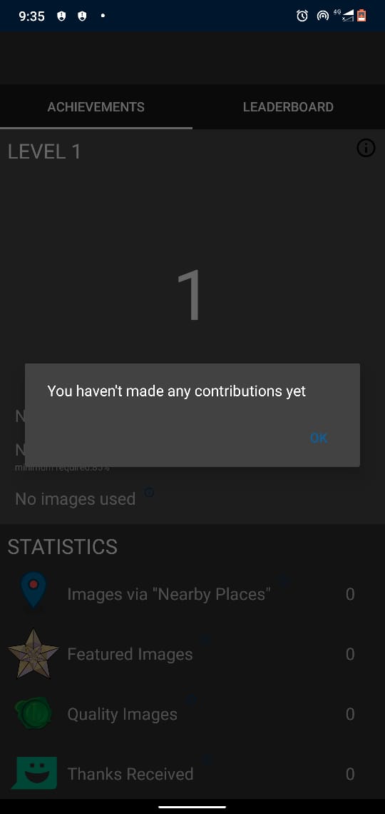 When the progress bar is active (still loading) numbers are shown in their respective fields, but as soon as the loading is finished a dialog "You haven't made any contributions" is shown, all the fields are set to zero and level reset to 1.