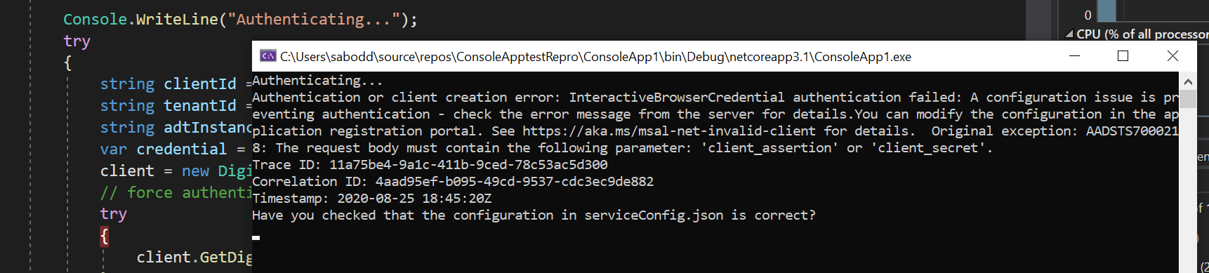 "Exception thrown: 'Azure.Identity.AuthenticationFailedException' in Azure.DigitalTwins.Core.dll