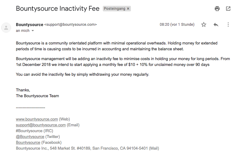 Not only are they telling me this a full 16 days after the start date of this fees, they also just deducted this fee from my account balance there right away. (This, fortunately, was "free" money they added to my account after the woes I had with them that triggered the creation of this issue, but if I had known about these inactivity fees in advance, I would have preferred to put it to better use than just letting them claim it back.)tl;dr Avoid BountySource.