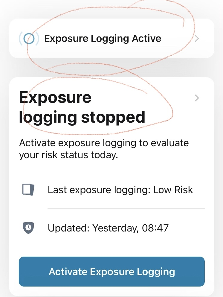 During startup the app (version 1.5.1) shows conflicting logging status information. ("Exposure Logging Active" vs "Exposure logging stopped", please see attached image)