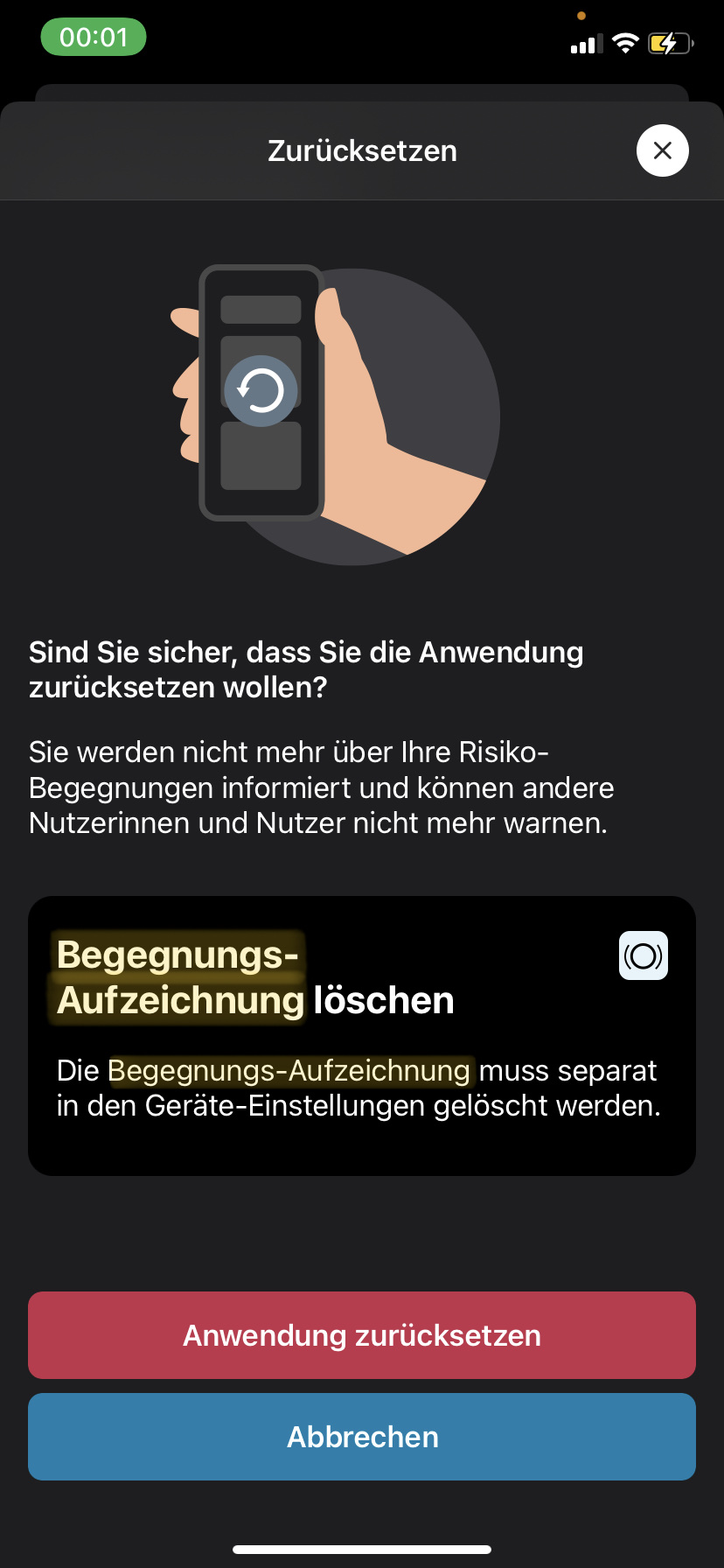 The info screen which is shown to the user before resetting the app talks about deleting "Begegnungs-Aufzeichnungen".