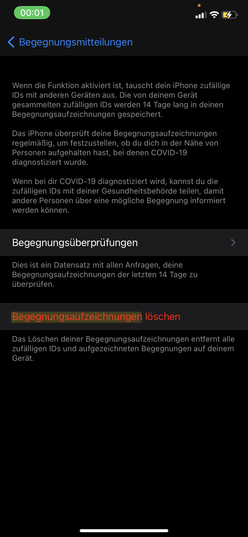 Die Begegnungsaufzeichnung muss separat in den Geräte-Einstellungen gelöscht werden.