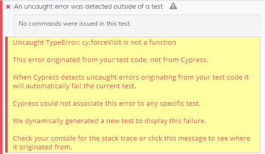Cypress.Commands.overwrite( 'visit', ( originalFn, url, options ) => { if(url.includes('localhost:12000')) { cy.window().then(win => { return win.open(url, '_self'); }); } else { return originalFn(url, options); } });