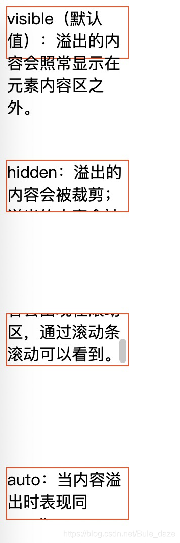 visible(默认值):溢出的内容会照常显示在元素内容区之外;hidden:溢出的内容会被裁剪;scroll:溢出的内容会出现在滚动区,通过滚动条滚动可以看到;auto:当内容溢出时表现同scroll;参考文档:overflow - CSS(层叠样式表) | MDN