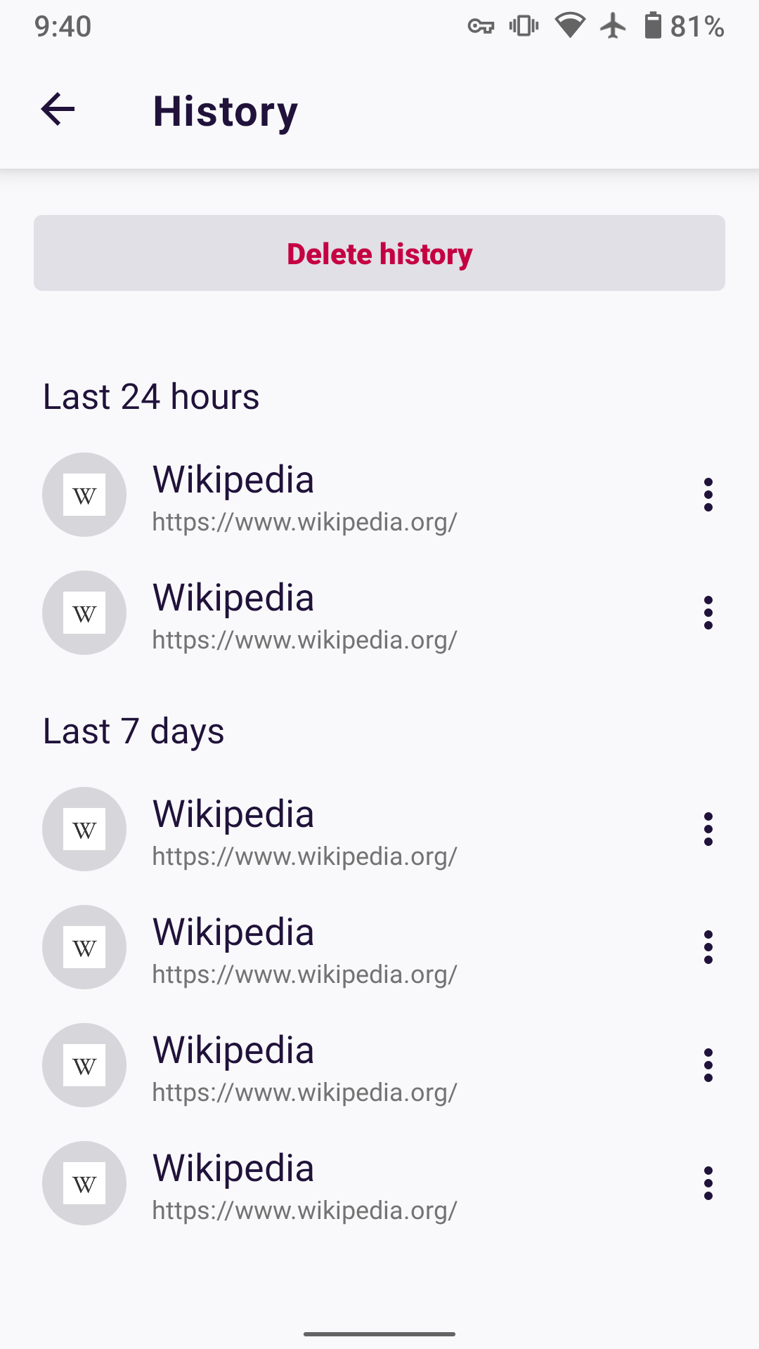 The spacing + dimension + colour we use on this page, should match our History and Bookmarks pages. Both pages use the same large icon (left side) and normal-size icon (right side). Although we donāt have caption underneath each label like those pages, the text sizes they use are correct.
