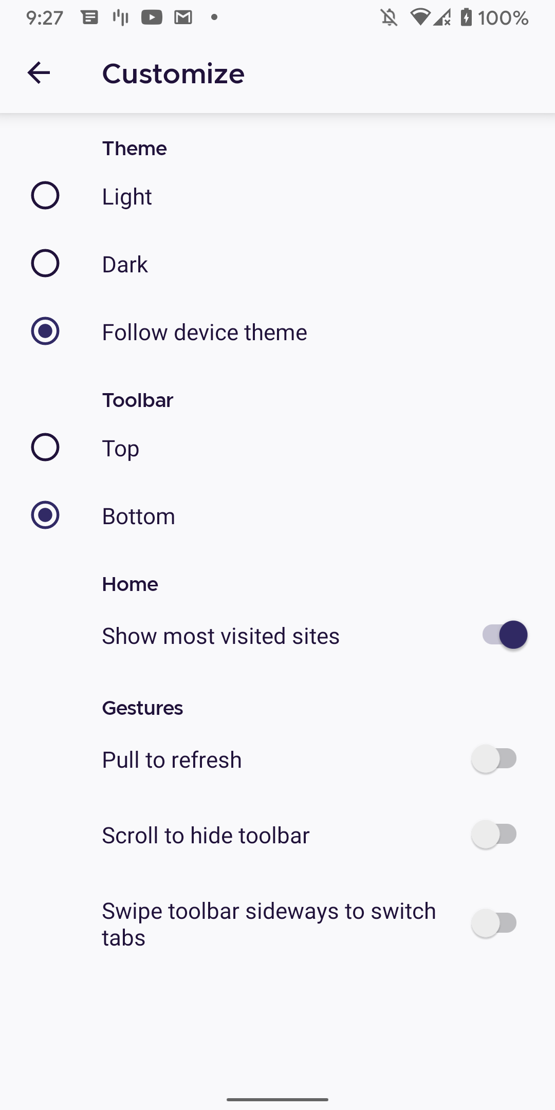 @brampitoyo @betsymi We also have swipe to switch tabs and I'll be putting up a PR for swiping up to open the tab tray soon. I think we'll probably want to have settings for these too since they are triggered right above the system gesture area when the toolbar is on the bottom. Also not sure if this is relevant for this, but the swipe to open tab tray gesture will only be active for the bottom toolbar (at least thats the current plan)