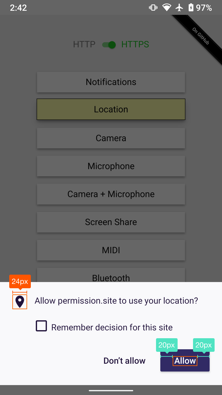 #20123a)Our dialogâs heading size (16dp) is actually correct. In fact, the heading of permission dialog needs to follow ours.