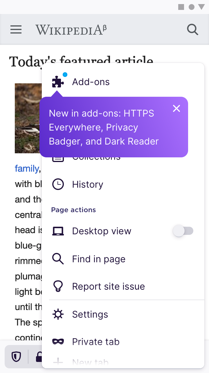 Inside the âAdd-onsâ submenu, the âAdd-ons managerâ menu item will have a blue notification dot. Underneath, the caption is labelled âNew add-ons availableâ.
