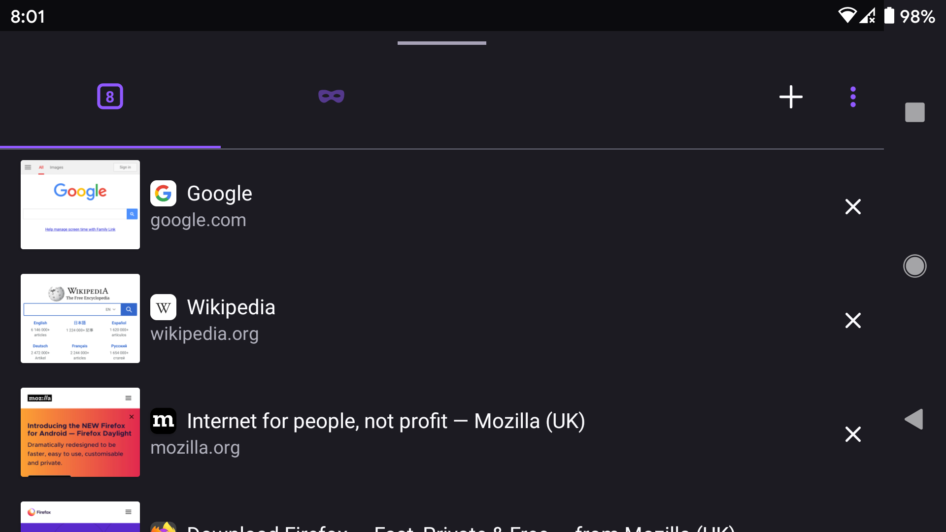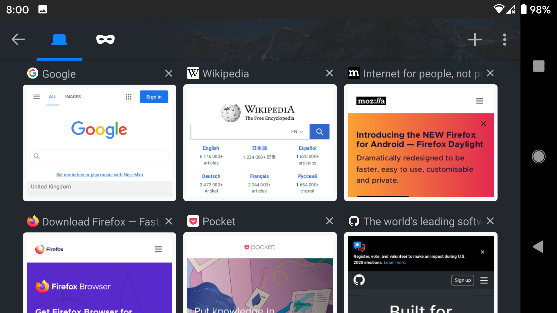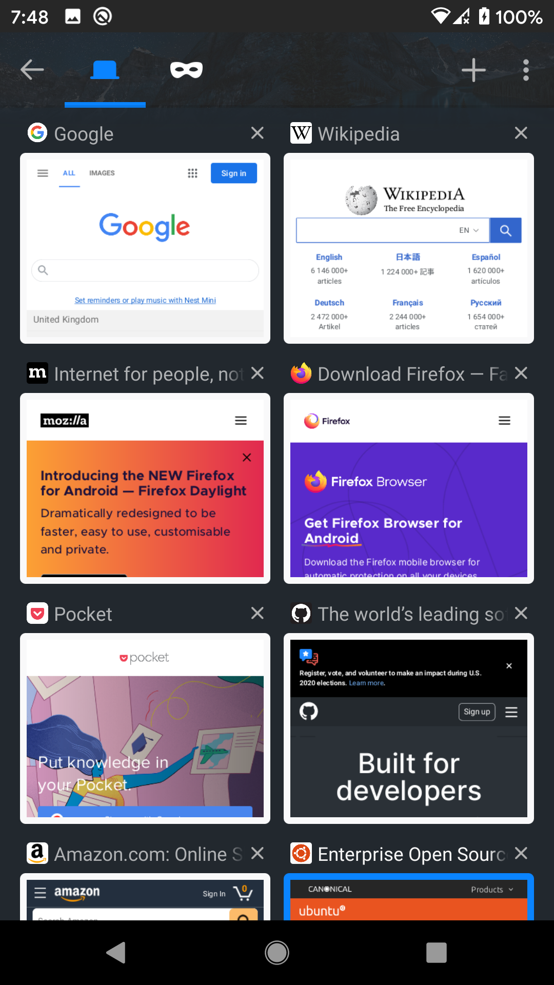 As you can see, the old Fennec could show 6 full tabs + 2 partial tabs. The forked Fenix with my compact tabs layout can also show 6 full + 2 partial tabs. It could show even more if the BottomSheet popup could occupy more screen space. The (mostly) unmodified Fenix layout can only show 6 tabs.