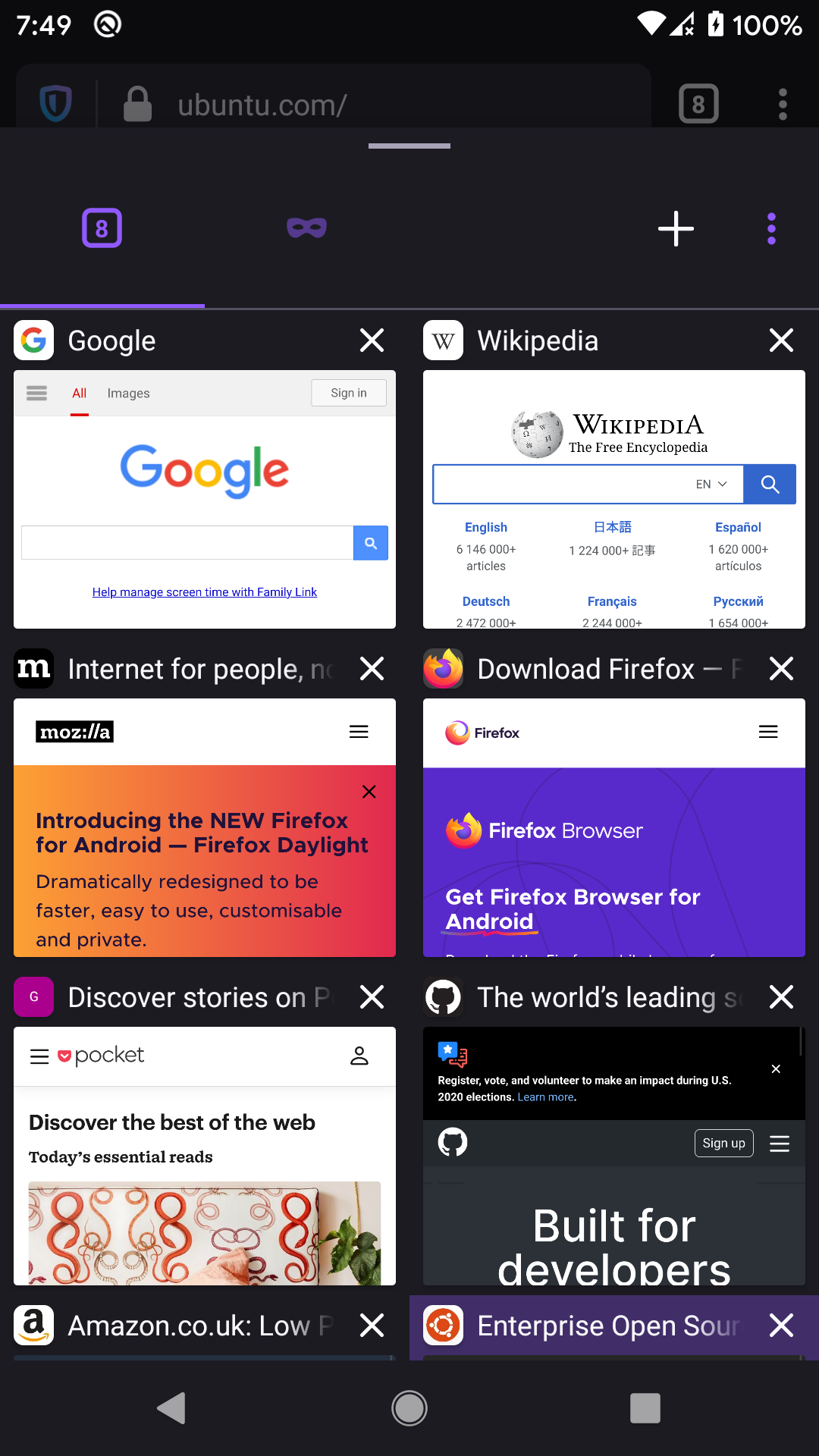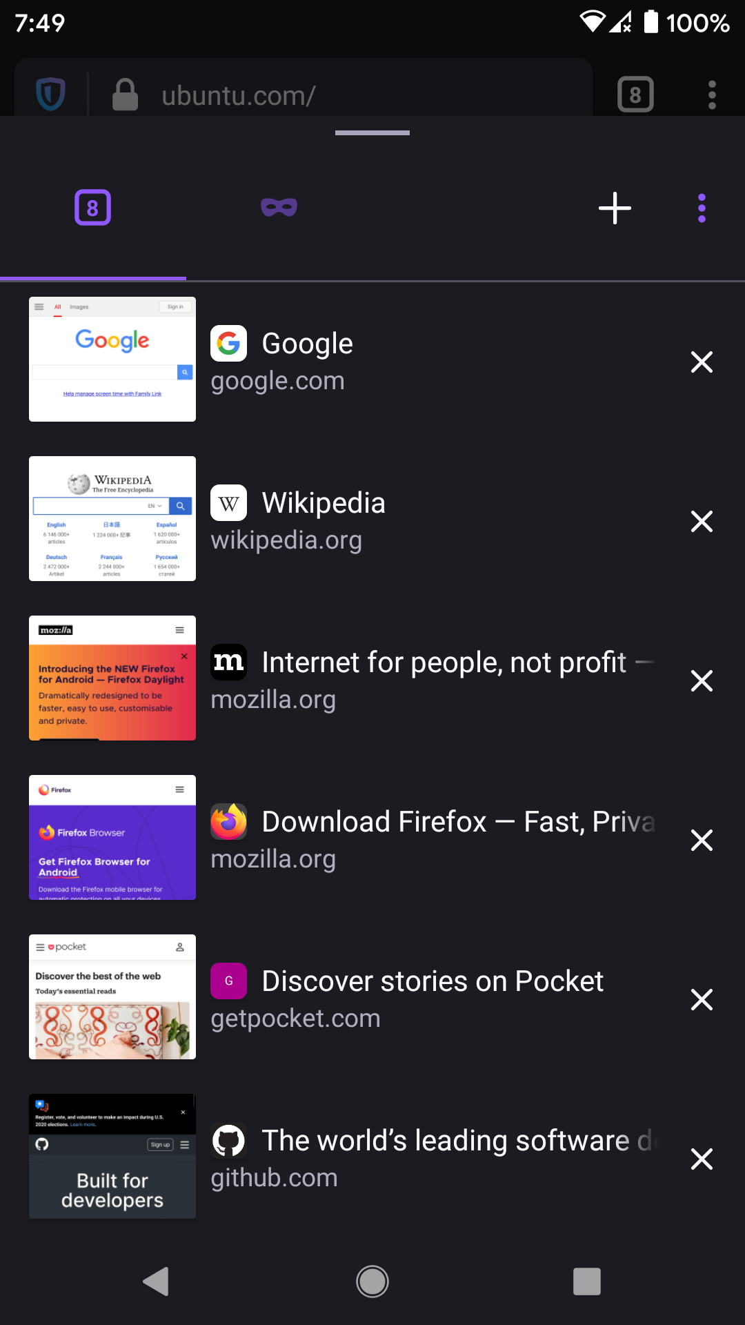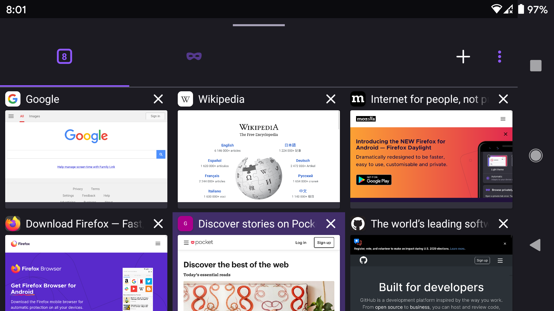 As you can see, the old Fennec could show 6 full tabs + 2 partial tabs. The forked Fenix with my compact tabs layout can also show 6 full + 2 partial tabs. It could show even more if the BottomSheet popup could occupy more screen space. The (mostly) unmodified Fenix layout can only show 6 tabs.