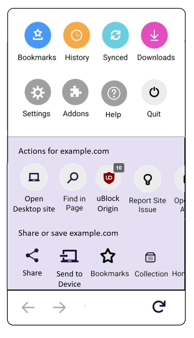 , that let you interact with the site (e. g. toggle desktop mode, find in page)Save/share