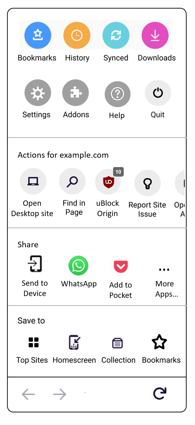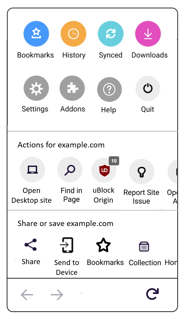 If you're looking for a different approach you could also have a look at the menu of Firefox Lite: