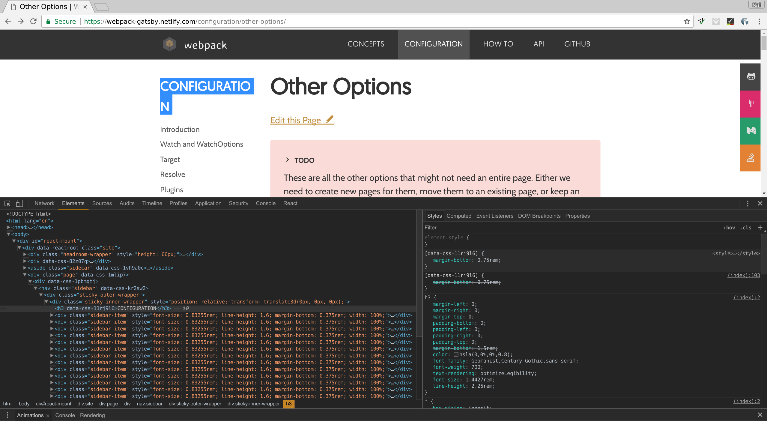 Hey folks — been working on design + components for Gatsby powered documentation sites. As a test case I've been working on a PR to convert the new Webpack website to use Gatsby. Would love feedback on the design, etc. as whatever that ends up being will be what we will use here (or very similar).