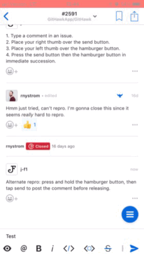 Alternate repro: press and hold the hamburger button, then tap send to post the comment before releasing.