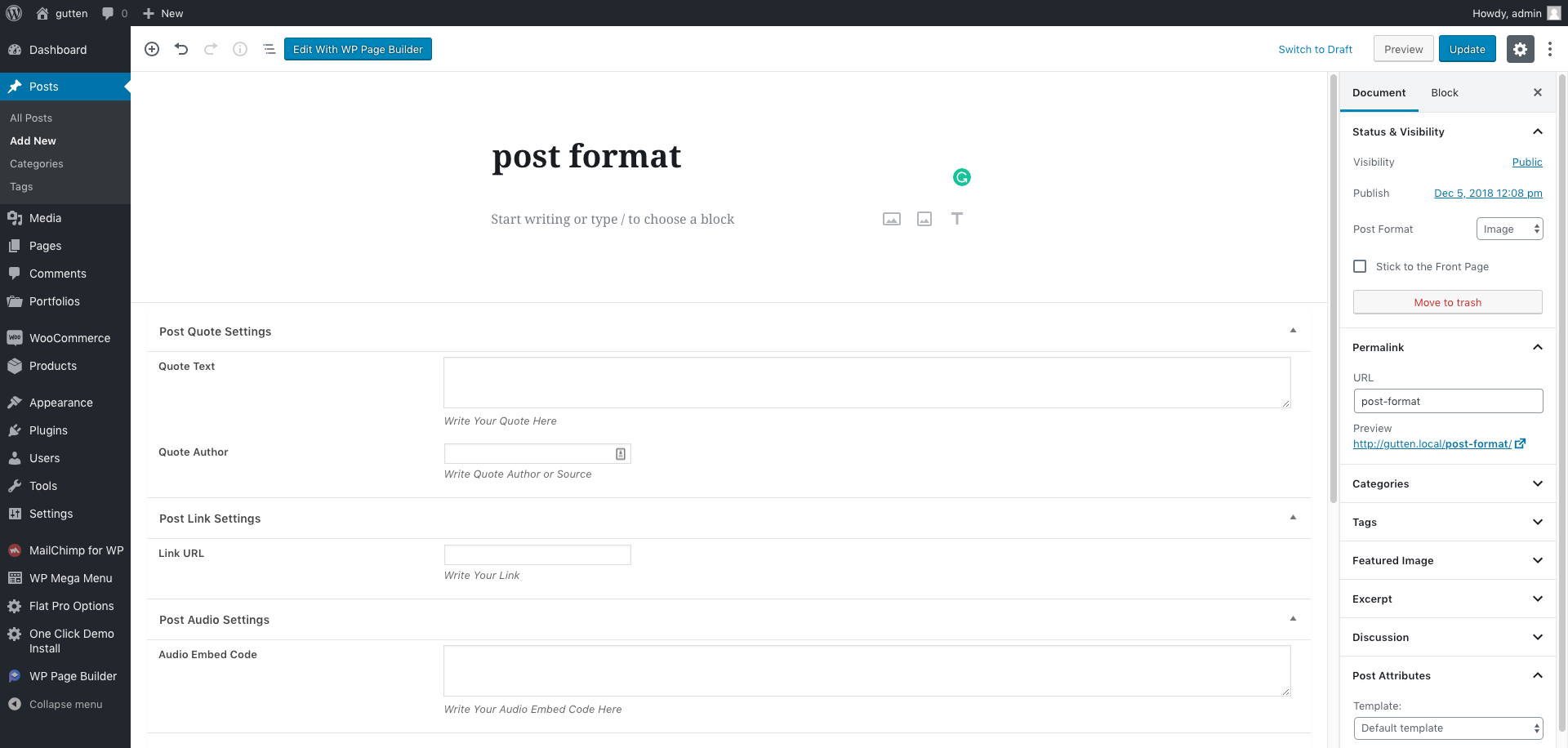 I am using FlatPro theme by Themeum. The post format select option lists all post formats and does not work while editing the post. There are no Console error.