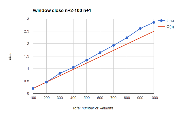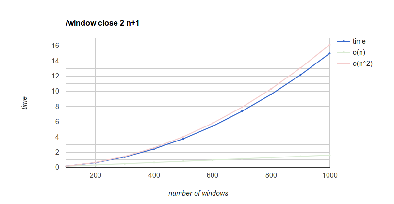 O(n) and O(n^2) reference lines are extrapolating from the time to close 100, where n means number of windows.