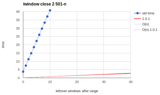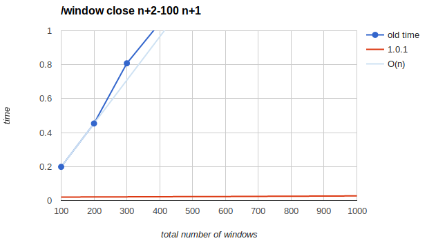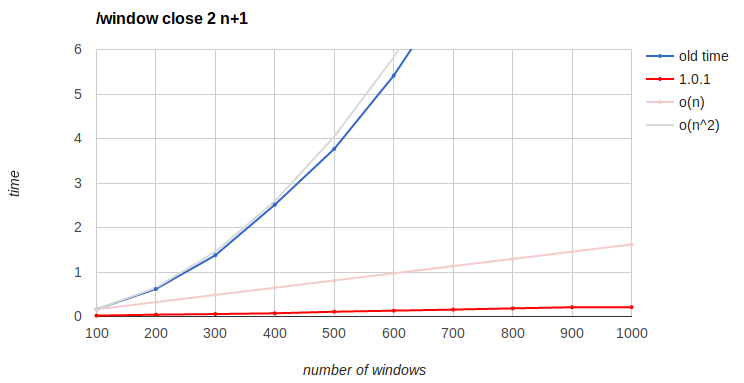 This is pretty good. It takes 5 seconds to close the last 100 windows of 2000, 10 seconds on 4000 and 25 seconds on 10000, so if you're stuck with that many windows, doing this one is several times is the best way to get out of that mess (assuming we haven't fixed /window close to behave like that by default, anyway)