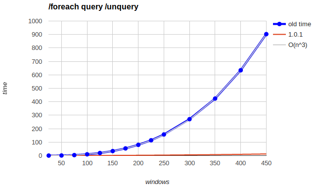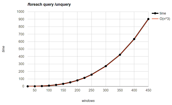 It's quadratic but the absolute times up to 1000 windows are pretty low, I think it's perfectly tolerable compared to the others. But 2000 takes a minute, 3000 takes two minutes, 4000 takes four minutes...