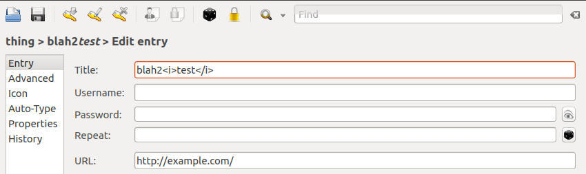 Related: the "headline" when editing an entry isn't properly sanitized. (See this screenshot.) Seems to use both Groups' names and Entrys' entryTitles, by way of EditEntryWidget::loadEntry's parentName parameter, called from (for example) DatabaseWidget::switchToEntryEdit and DatabaseWidget::switchToHistoryView. QLabels should probably be similarly sanitized.