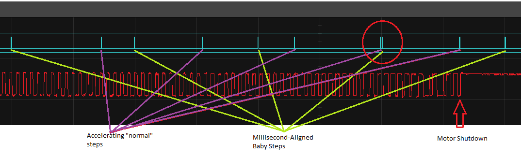 I'm out of ideas to get it to happen on my machine. My goal was to reproduce the issue, the do a mixed-signal capture of the motor outputs and the step pulses at the same time. My hypothesis is that prior to shutdown, we will see two step pulses unreasonably close together just before the motors turn off.