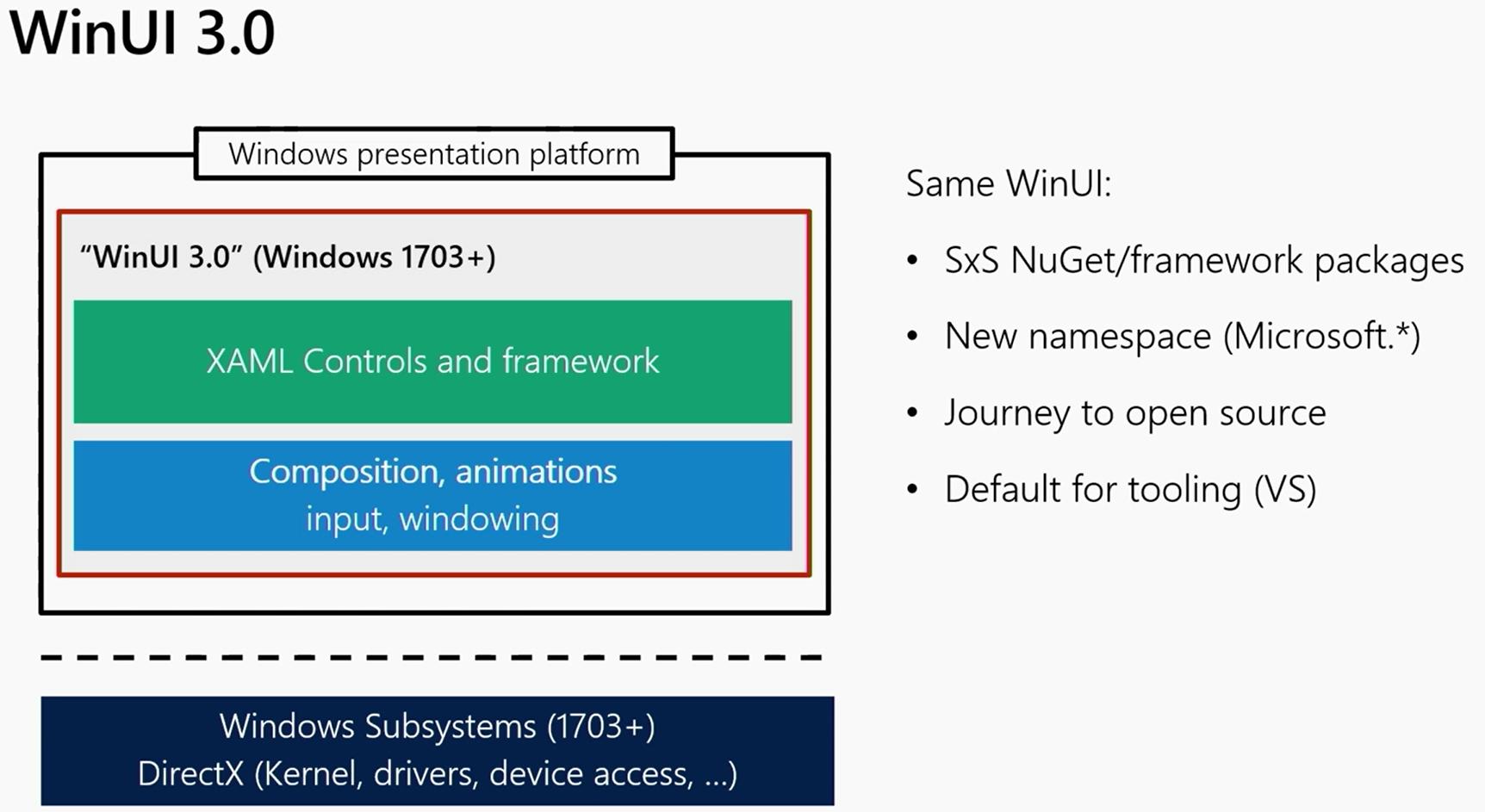WPF, WinForms, WinUI 3.0, Fabric - these will all be open source, and updateable outside of the Windows OS. So a new control in one, could be added to the others, and their designs adjusted to match - truly making it a single Windows App Platform as mentioned at Build 2019