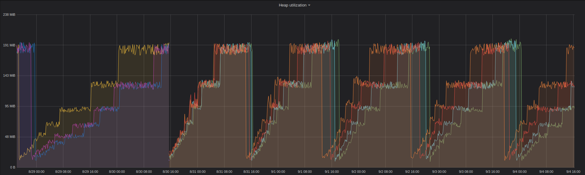 The graph below shows runs against two consecutive nightly releases (the scale changes so that the increased memory usage isn't off the top of the chart). node v11.0.0-nightly20180907e917a23d2e