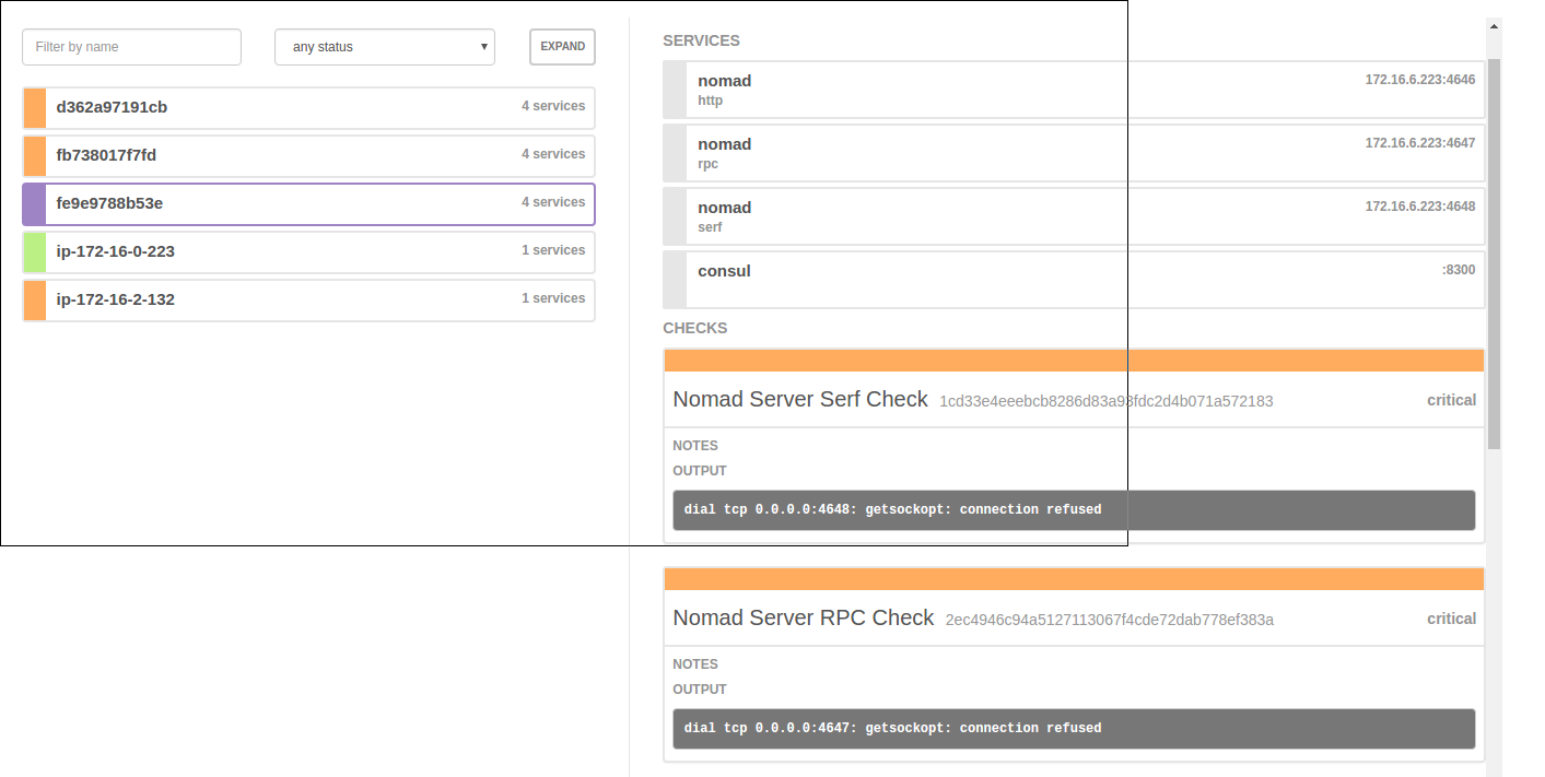 All checks on the nomad servers (which are inside containers) also do not work complaining dial tcp 0.0.0.0:4648: getsockopt: connection refused, here's config for details https://gist.github.com/e8bfb38ab73da1d3df244dc28bf5a5a8