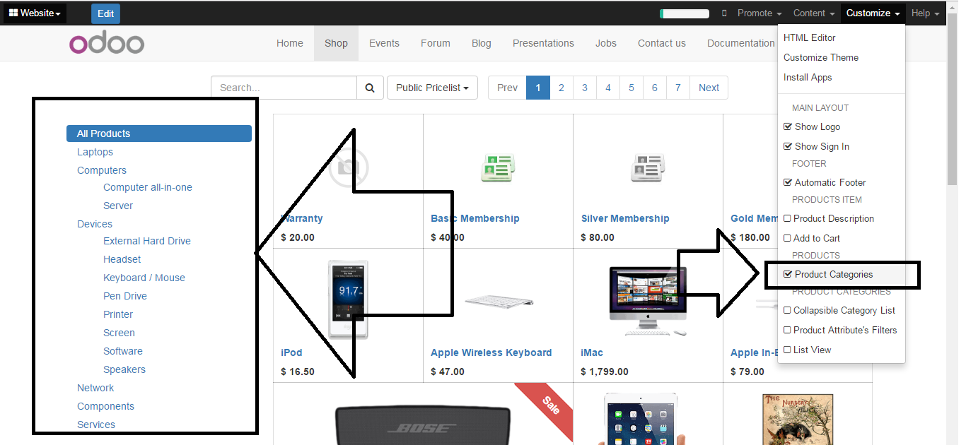 In website sale odoo / shop I can add the menu to the left of the page containing each category