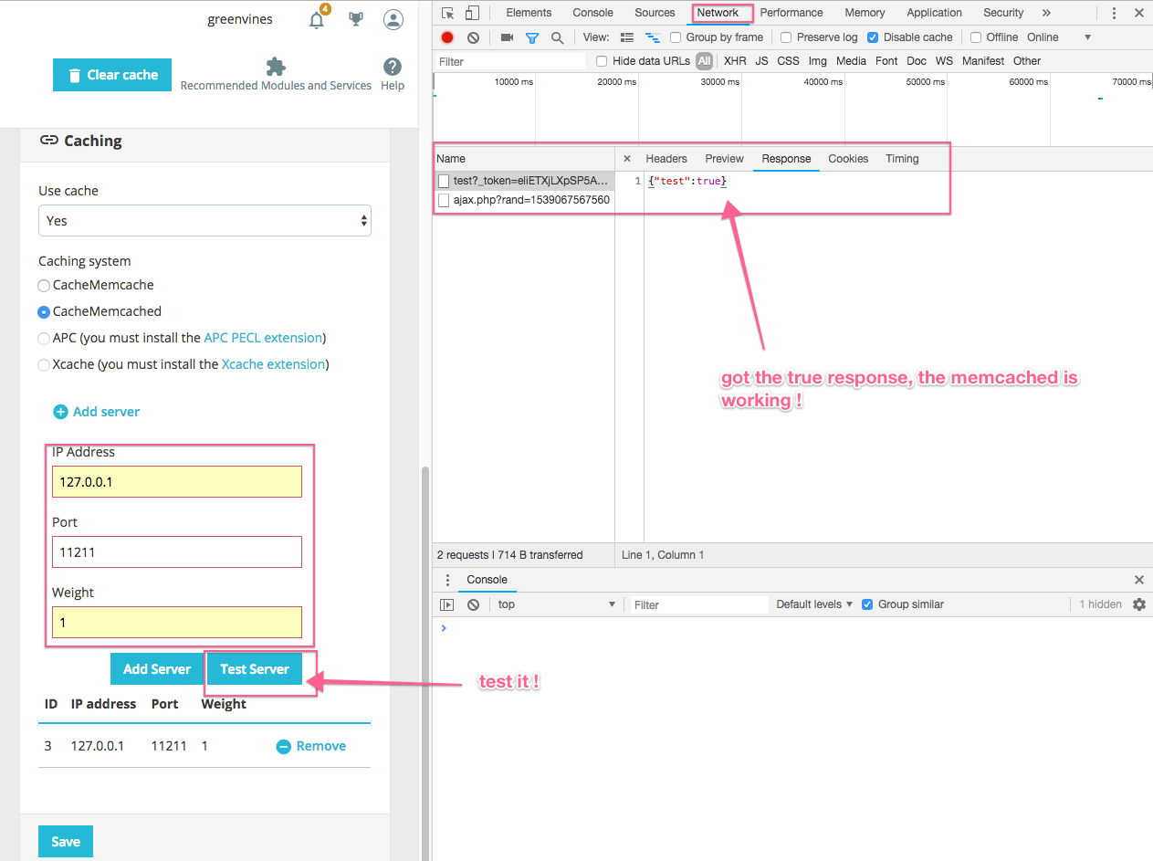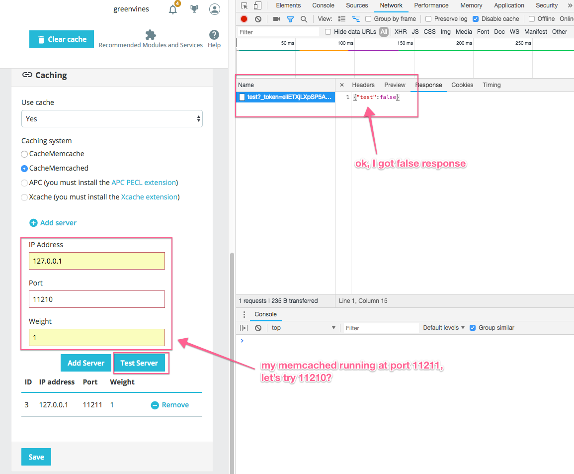 However, when I try to enable this caching feature at 1.7.4.X and set the IP Address, Port, Weight and pressed the Test Server button all lights up in red ...?!?