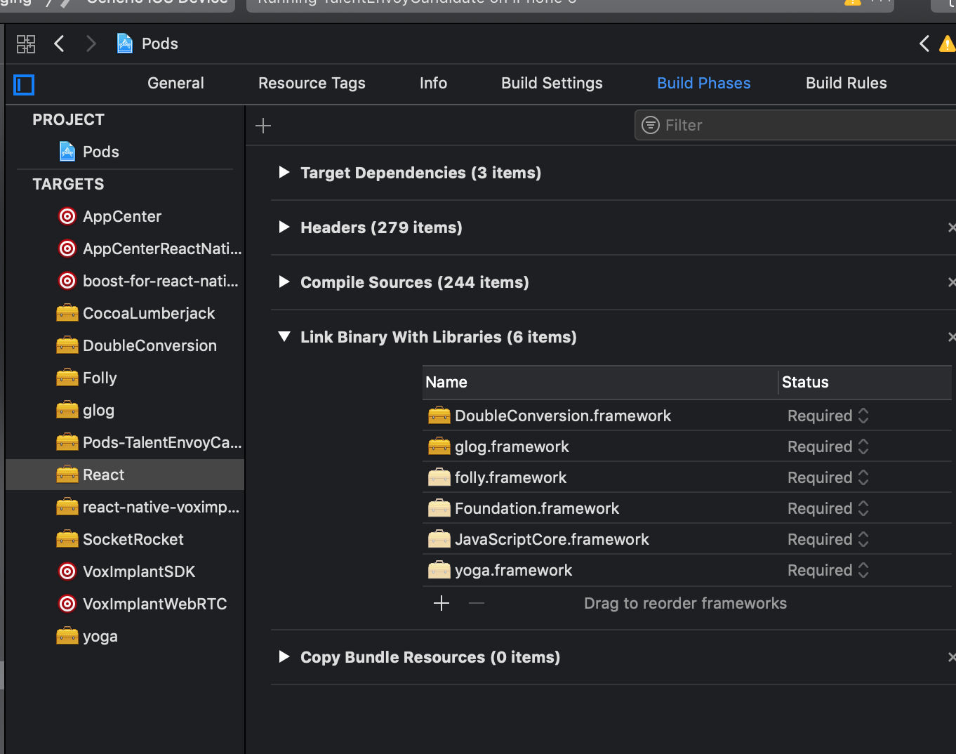 @JNdhlovu working manually adding DoubleConversion and glog to Link Binary With Libraries of React framework target in @CocoaPods project.