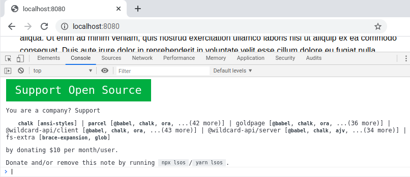 console.log to the browser dev console.Creating a long-term relationship between open source developers and companies is the name of the game for donations. That's for example why we are currently redesigning the donation-reminder to make it more friendly and more transparent. (If you look at the donation-reminder I posted in my previous reply: it's a cold anonymous message, and users don't know where it's coming from which is a big no-go.) The goal here is to build a relationship and, yes, a donation-reminder is annoying but it is removable simply by entering npx lsos remove/yarn lsos remove.