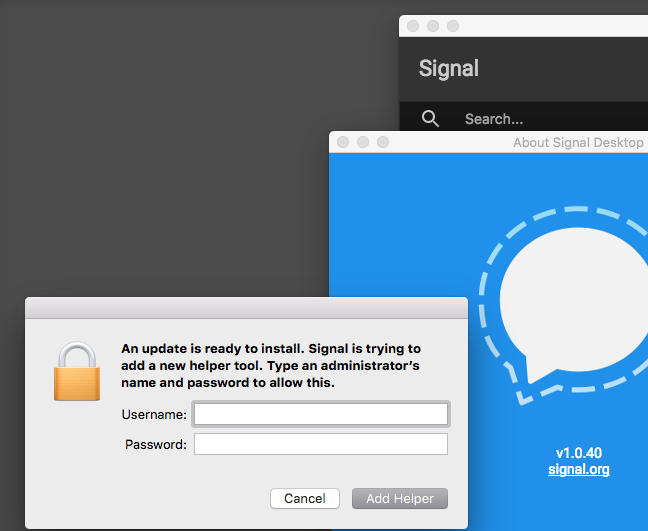 The dialog popping up is vexing, and is a consequence of Signal automatically updating. Not running your day to day account as admin is best practice and, as a fellow developer, I thought it was best practice to develop, test, build and deploy on least privilege to make sure it all works properly.