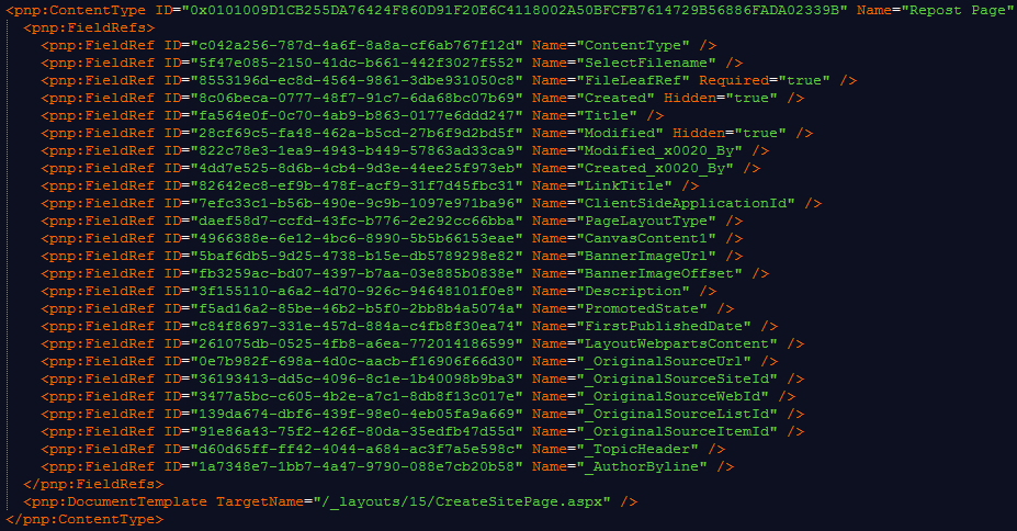 <pnp:ContentType ID="0x0100240A55DF4AAE484BAFA63308338F5501" Name="TestCT" Description="" Group="TEST" NewFormUrl="" EditFormUrl="" DisplayFormUrl="">