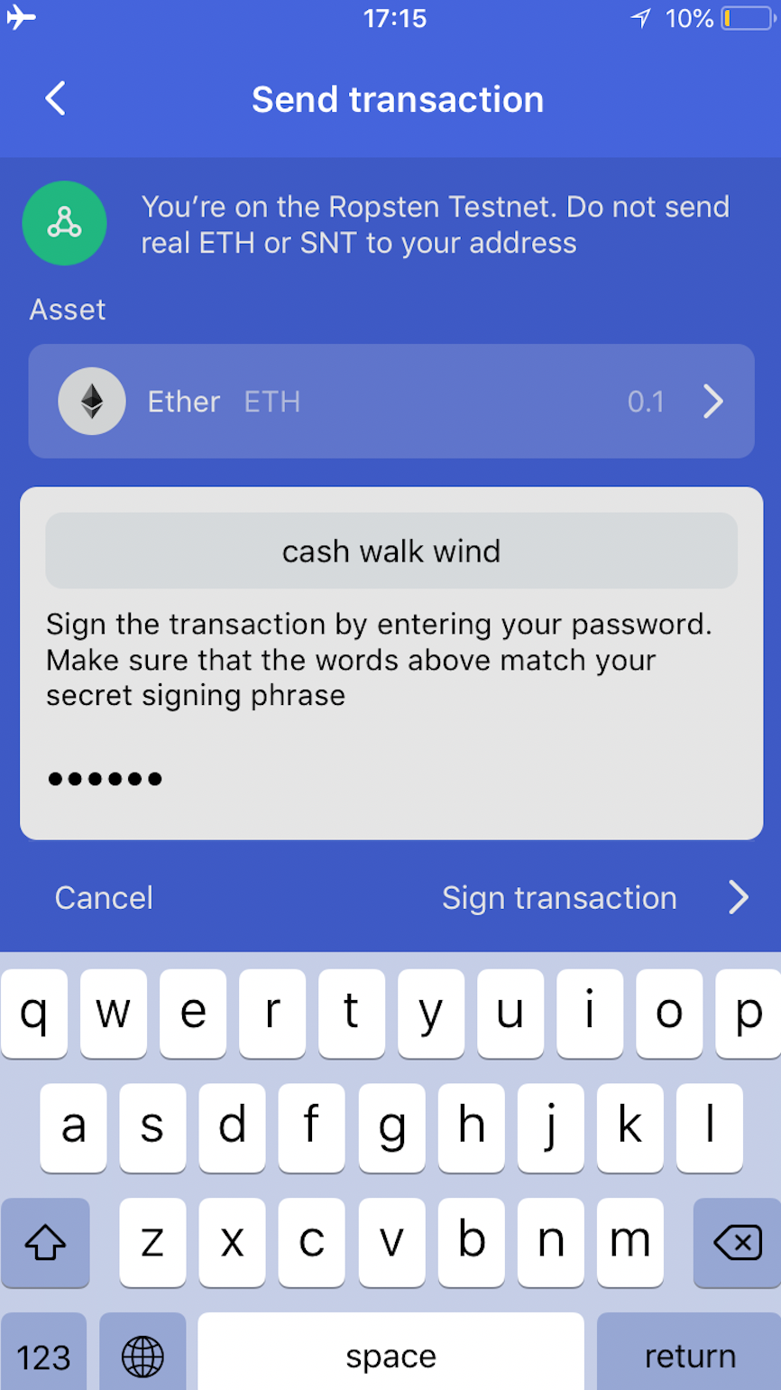 Transaction is not signed. The app does not react when "Sign transaction" is pressed. An error with technical description appears.