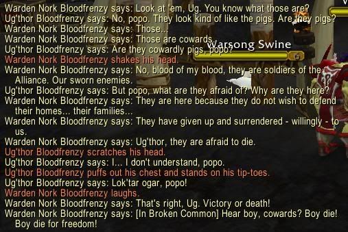 after his son says the line about "are they pigs?" Nork should do a laugh emote and the text should come up "Warden Nork Bloodfrenzy laughs" but i missed it for some reason.