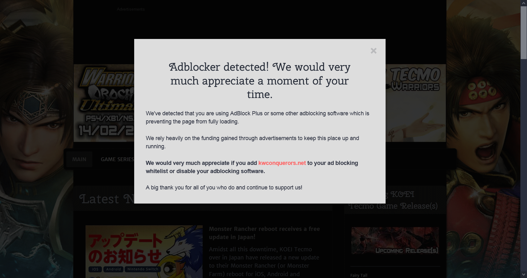 An example BABY anti-adblock popup: