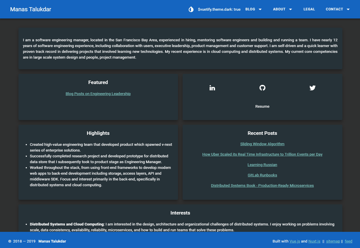 scripts/create_blog_metadata.py. The prerequisite python packages can be installed using the scripts/python-requirements.txt file.npm run nuxt-devchange theme icon in the top nav bar. Your theme will now change from the default dark to light.Legal in the top bav bar).Colors as defined under theme options stay put after navigation to a different link, even though the theme property has changed from dark to light and vice versa.