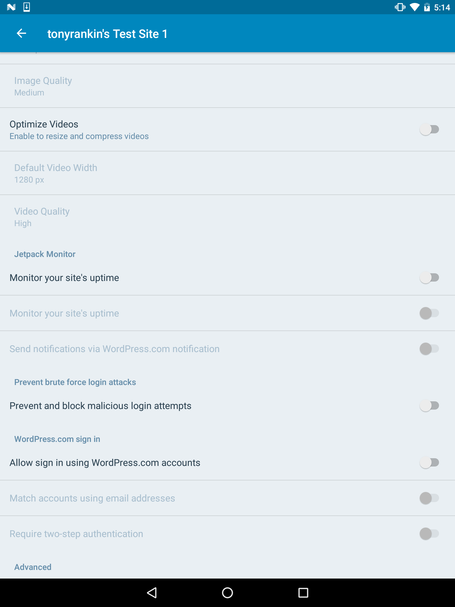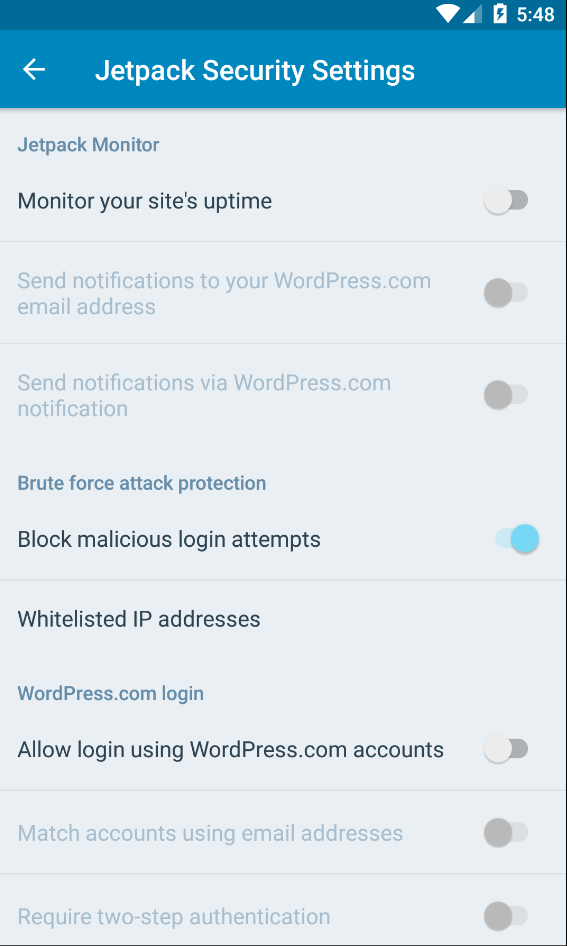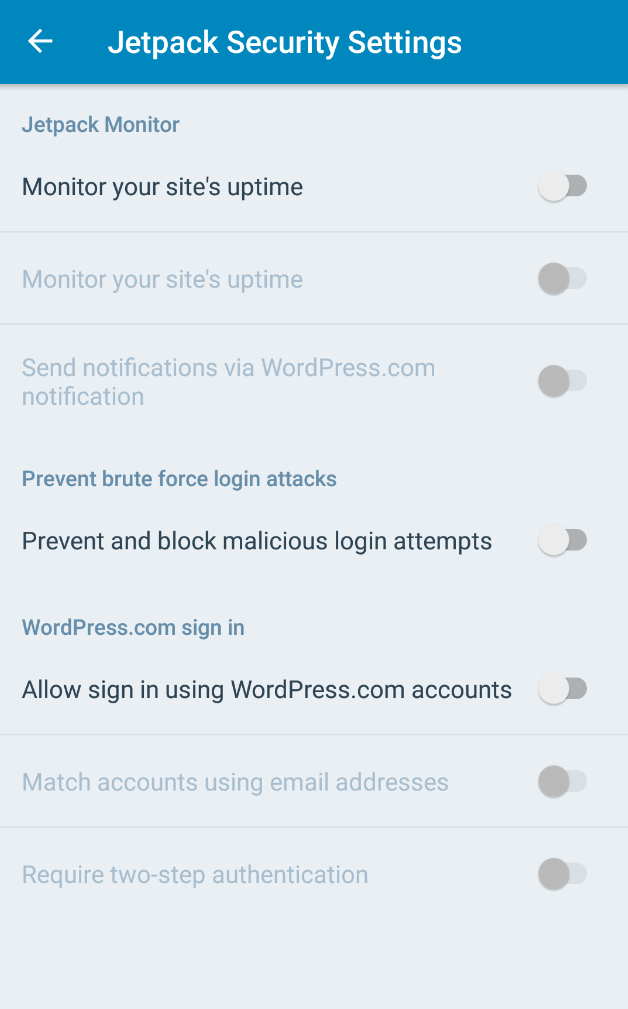 @mattmiklic I'm going to need a bit of guidance on where to put these settings. Do you think they should live in the existing Site Settings screen? I'm thinking a separate row for Jetpack Security on the My Site tab might be better.