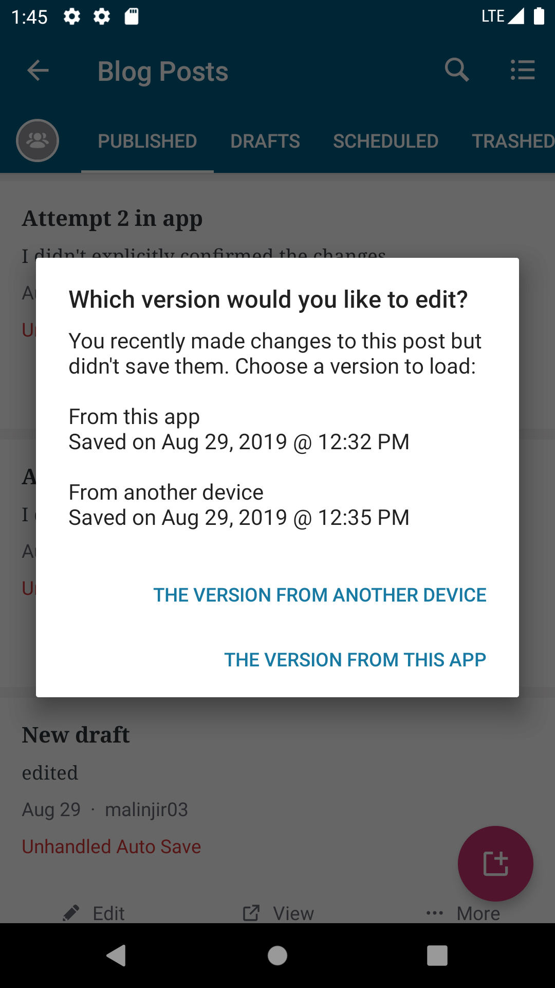 We currently show "Unhandled Auto Save" when the user edits a post on another device (eg web) and leaves the editor without saving the changes.