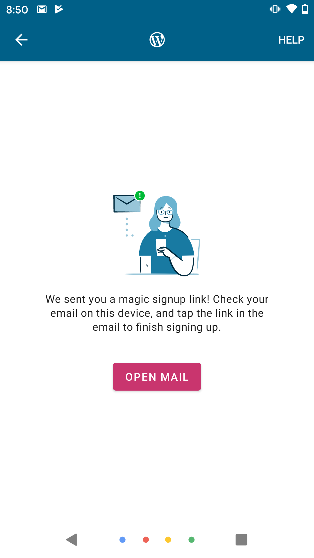 I expected that when I followed the steps to create an account through WordPress.com in the app, I would be receiving the email or if not given the option to continue creating an account manually.