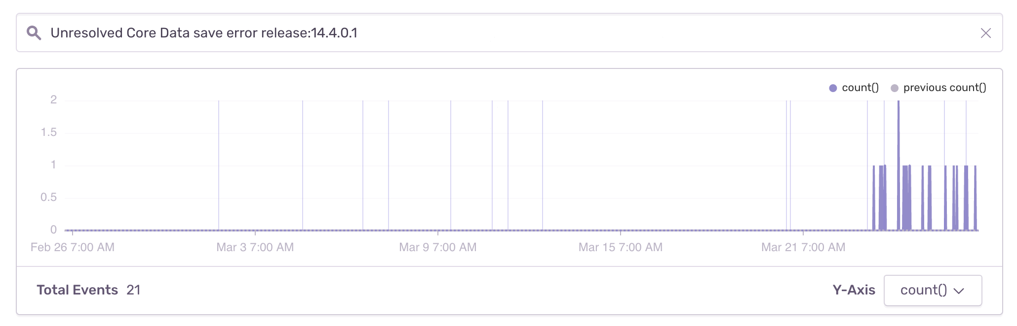 Looking again at the search results for Unresolved Core Data save error in Sentry, I'm seeing 345 crashes in 14.3.0.3 (screenshot) since it was released on Mar 9 and 21 crashes so far for 14.4.0.1 (screenshot) since it was released 4d ago on Mar 23.