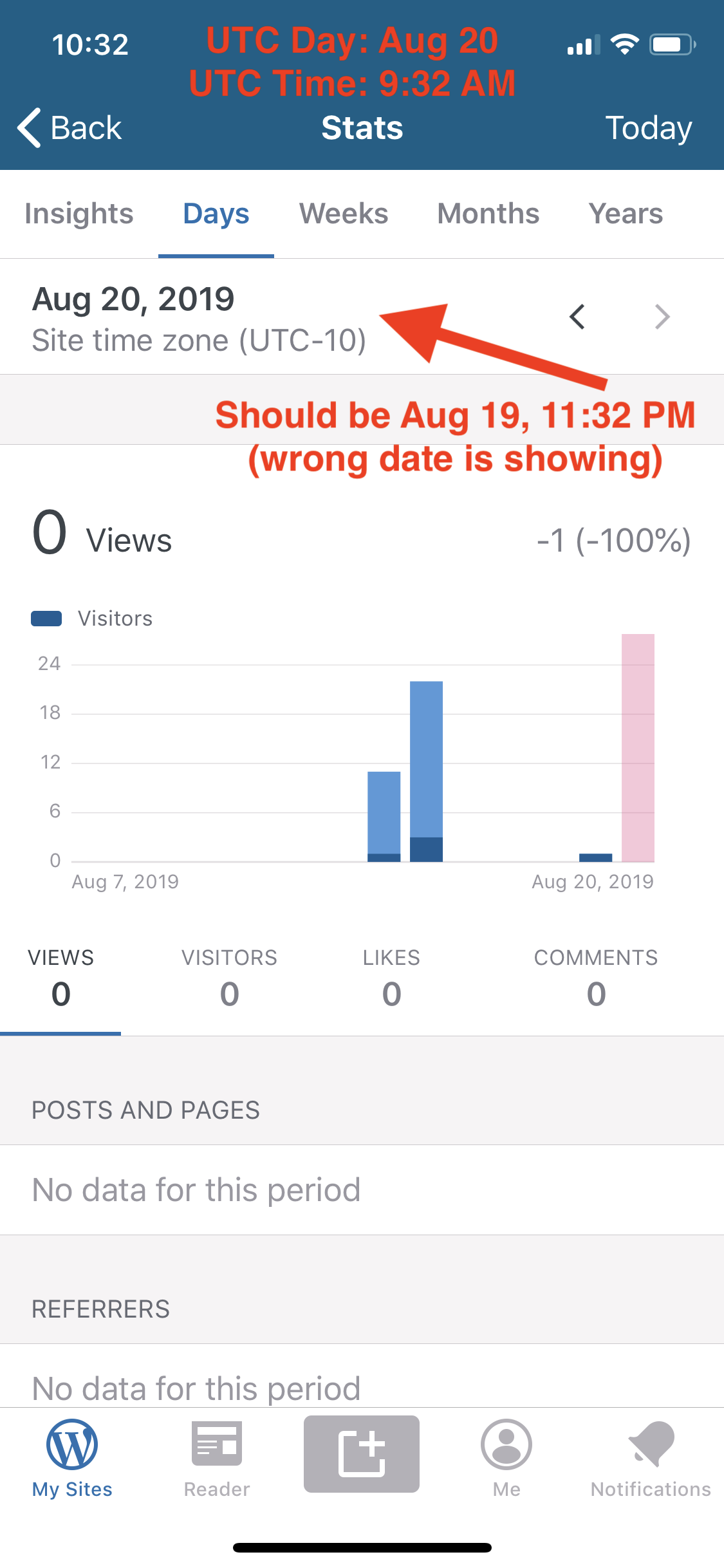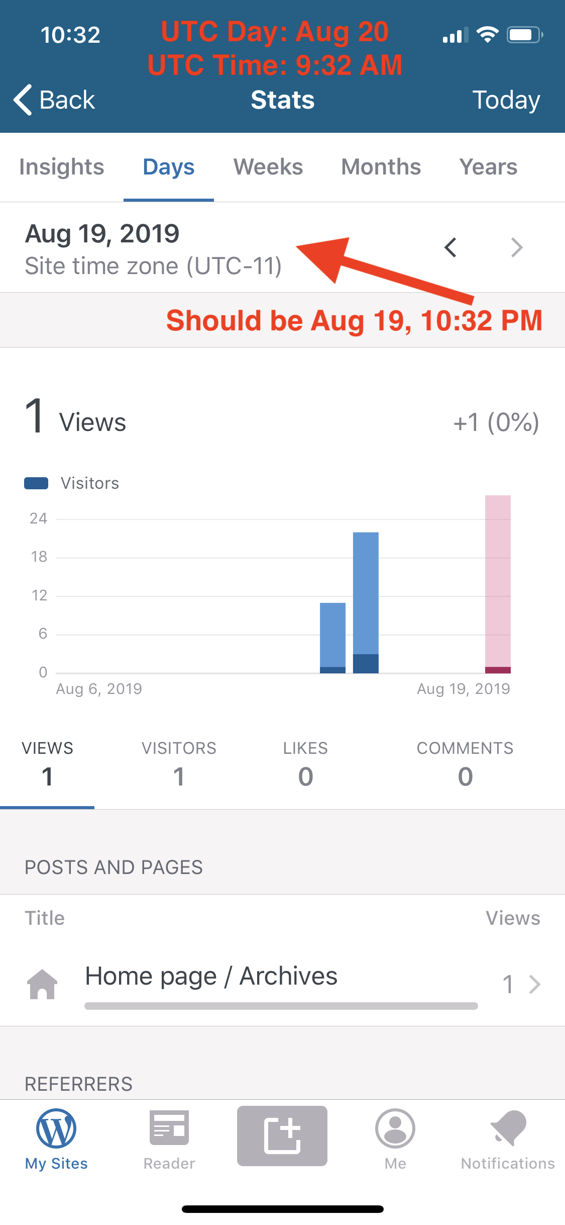 A user reported seeing this when their stats showed the wrong day. The site is set to UTC-4, and the device is in UTC-4, but the stats didn't update to the next day until 4:00 AM (which matches a UTC-8 timezone).