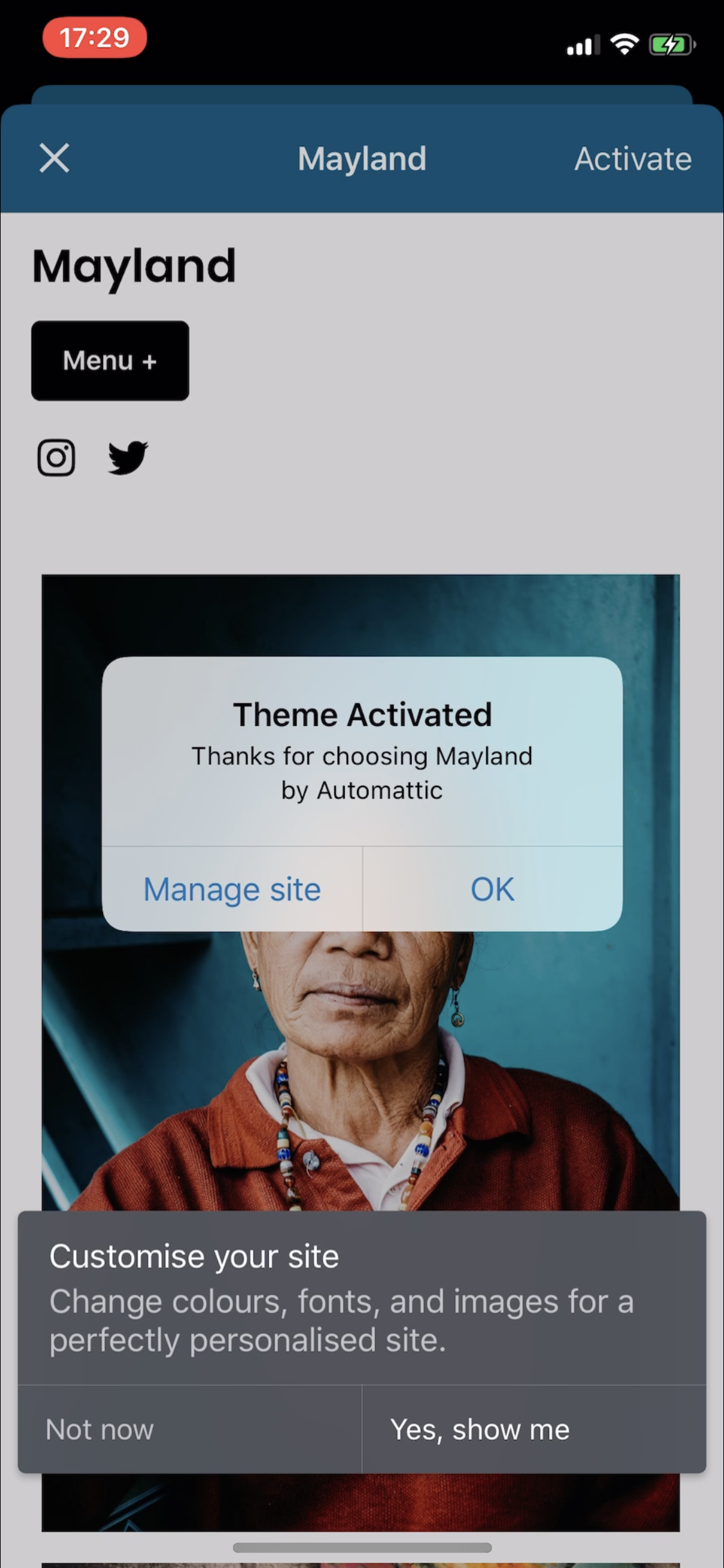 In the current UI, as soon as users tap on 'Activate', the 'Themes Browser' is dismissed "behind the scenes" (the navigation controllers pops to root before the theme preview is dismissed), so as soon as they close the theme preview, they will see the 'My site' page. For this reason, and since it's an acceptable solution, I am going to show the next step when they go back to 'My Site'.