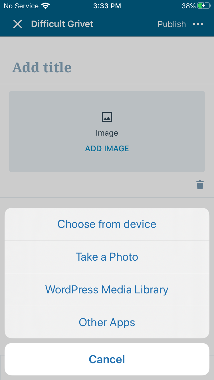 In the editor I get an error that "Can't place media" when I try to include a photo. I retry but with same result. Sometimes it shows the error message "WordPressKit.wordpressorgxmlrpcapierror 0", at other times it says it may be because the photo is to big or has the wrong file format. The strange thing is that the photo is actually uploaded to the server, I can see the photo in the upload directory on the server, and in the media library in Wordpress Admin Panel.