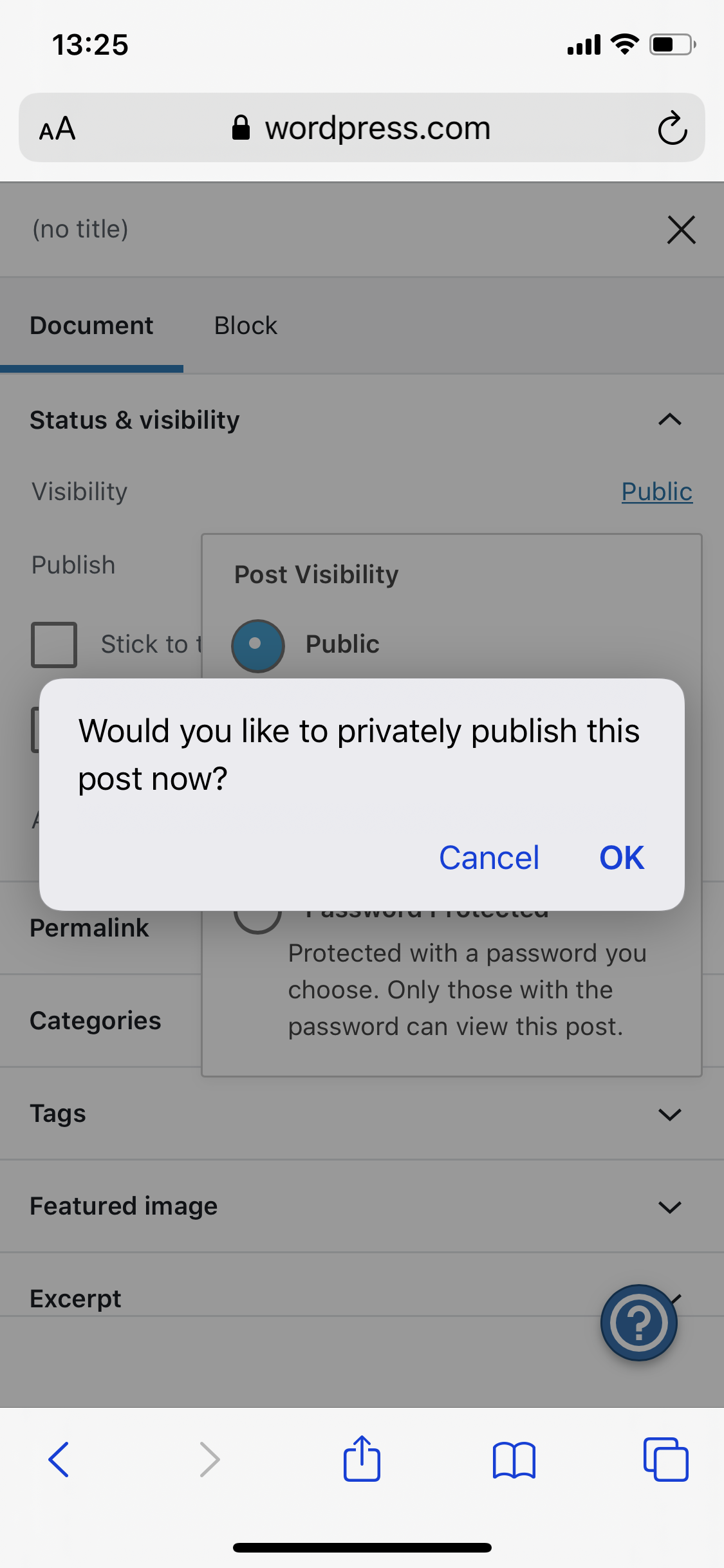 If I cancel there, the status isn't changed to "Private." If I accept, the post is published.