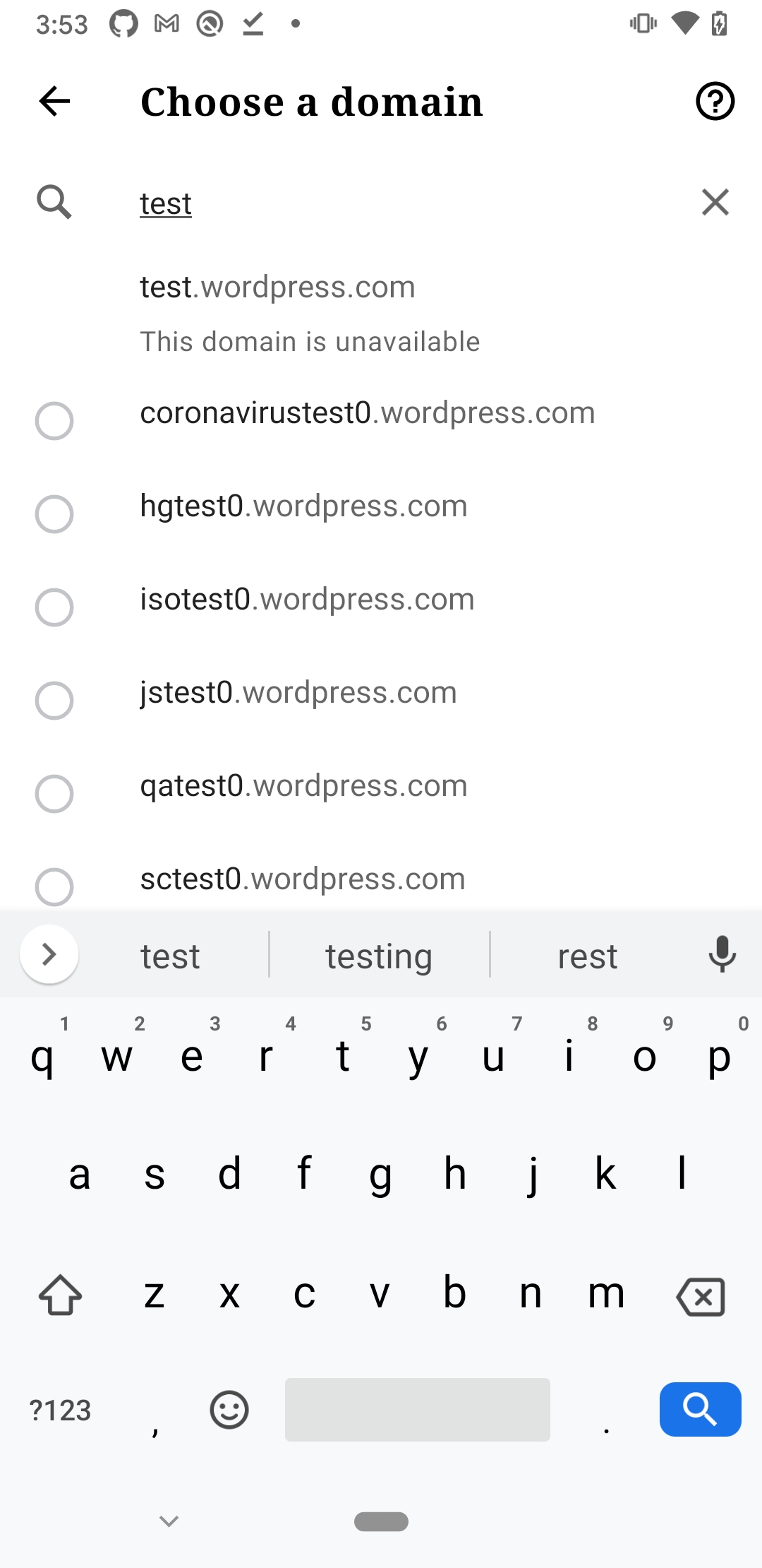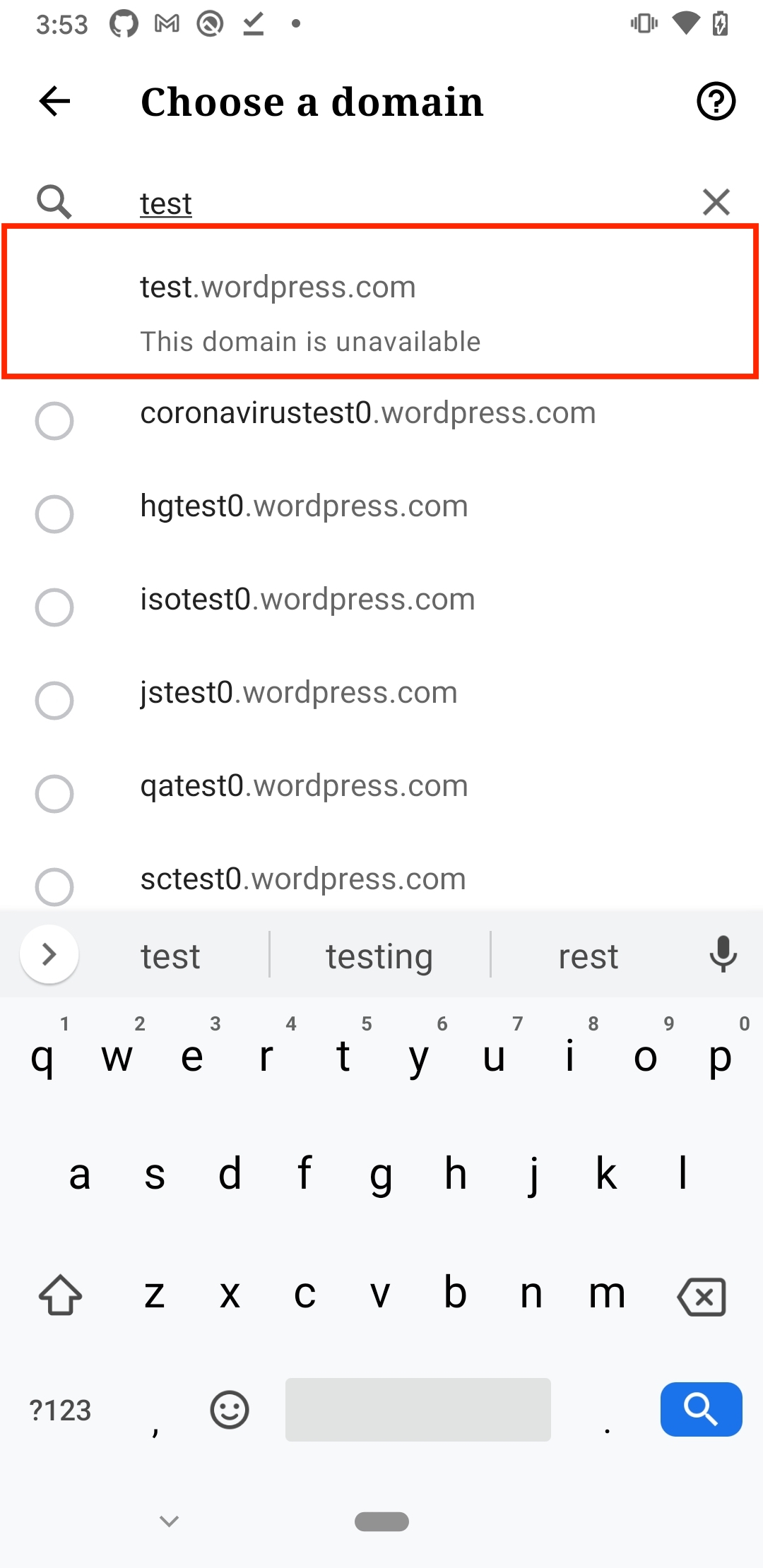 When you search for a domain on Android during the site creation flow, it returns results that include "This domain is unavailable" and more results than the iOS flow.