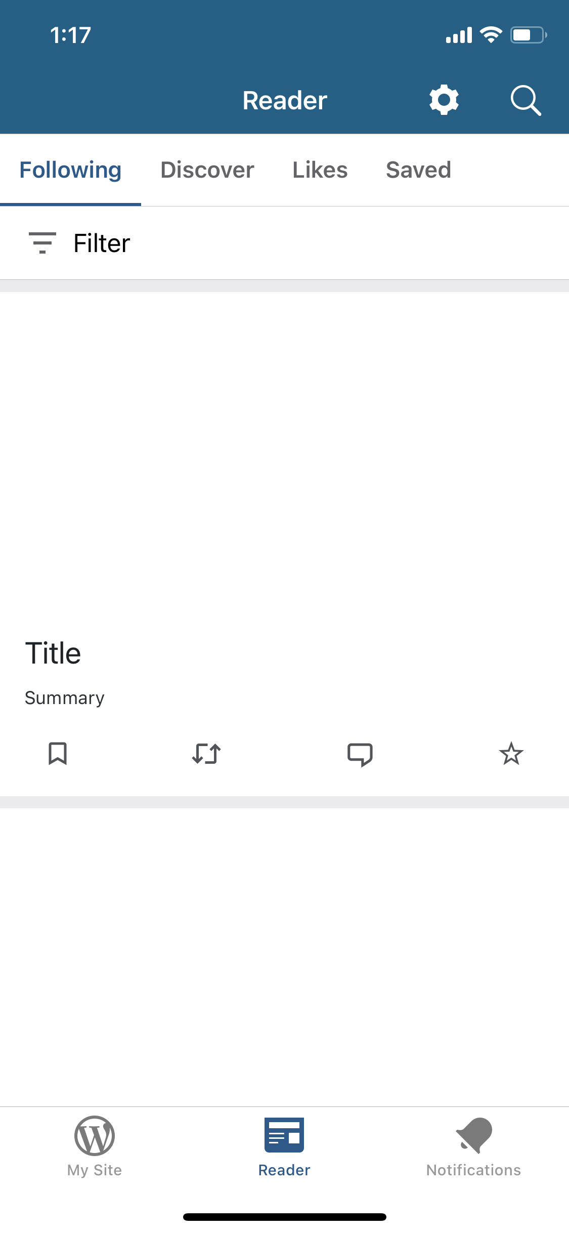 If I open a Reader screen, see a ghost view (because content is being loaded), and switch to another tab in the app, then when I open the Reader again I see placeholder content that doesn't scroll.