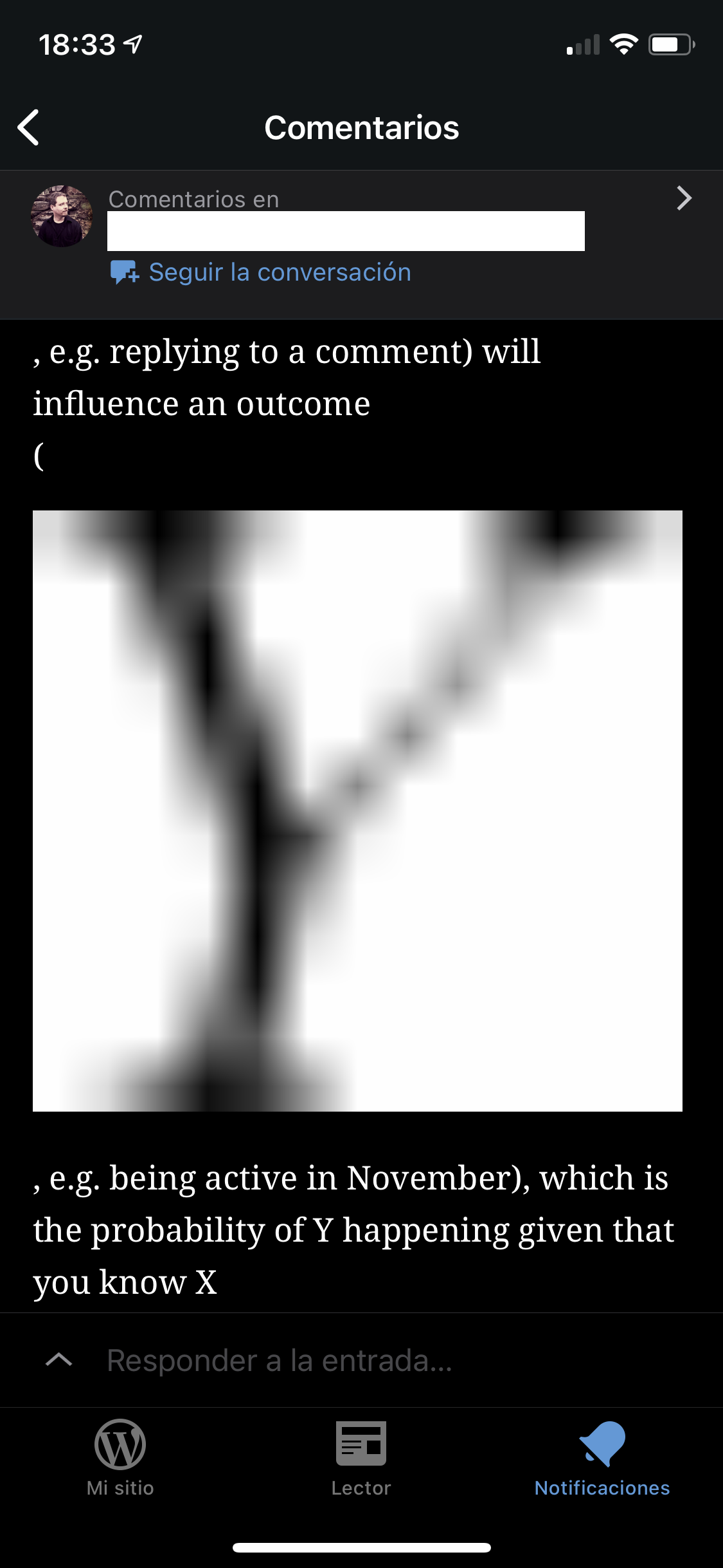 but here’s my understanding of the problem: you want to measure how a certain event (<img src=\"https://s0.wp.com/latex.php?latex=X&;bg=ffffff&;fg=000&;s=0&;c=20201002\" alt=\"X\" title=\"X\" class=\"latex\" />, e.g. replying to a comment) will influence an outcome (<img src=\"https://s0.wp.com/latex.php?latex=Y&bg=ffffff&fg=000&s=0&c=20201002\" alt=\"Y\" title=\"Y\" class=\"latex\" />, e.g. being active in November), which is the probability of Y happening given that you know X (<img src=\"https://s0.wp.com/latex.php?latex=P%28Y%7CX%29&bg=ffffff&fg=000&s=0&c=20201002\" alt=\"P(Y|X)\" title=\"P(Y|X)\" class=\"latex\" />).