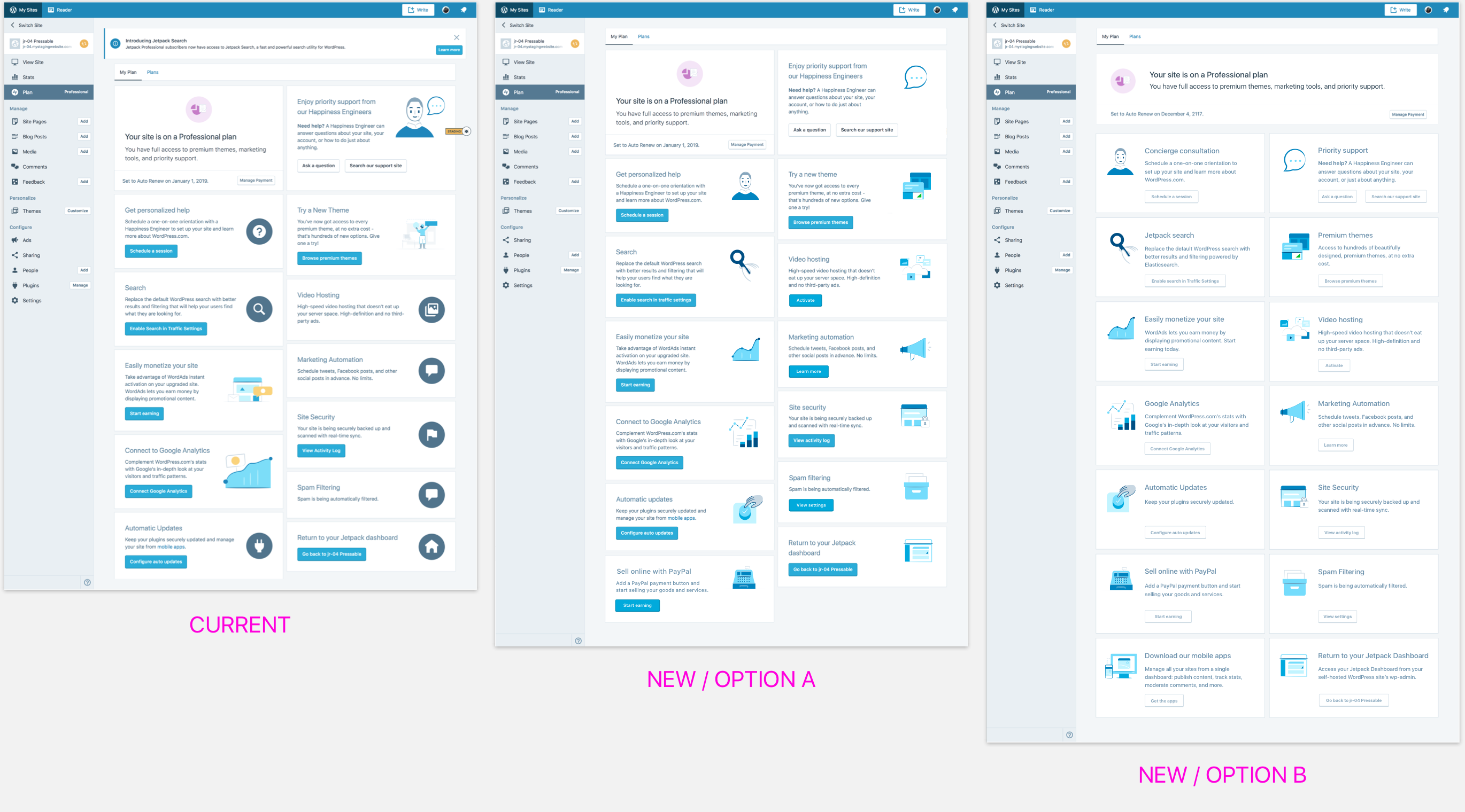 The far right mockup (NEW / OPTION B) introduces our updated My Plan page (see p6TEKc-1Qp) and includes fixed height cards and an updated My Plan card that's full width. I recommend moving forward with this version, if timing and dev resources permit.