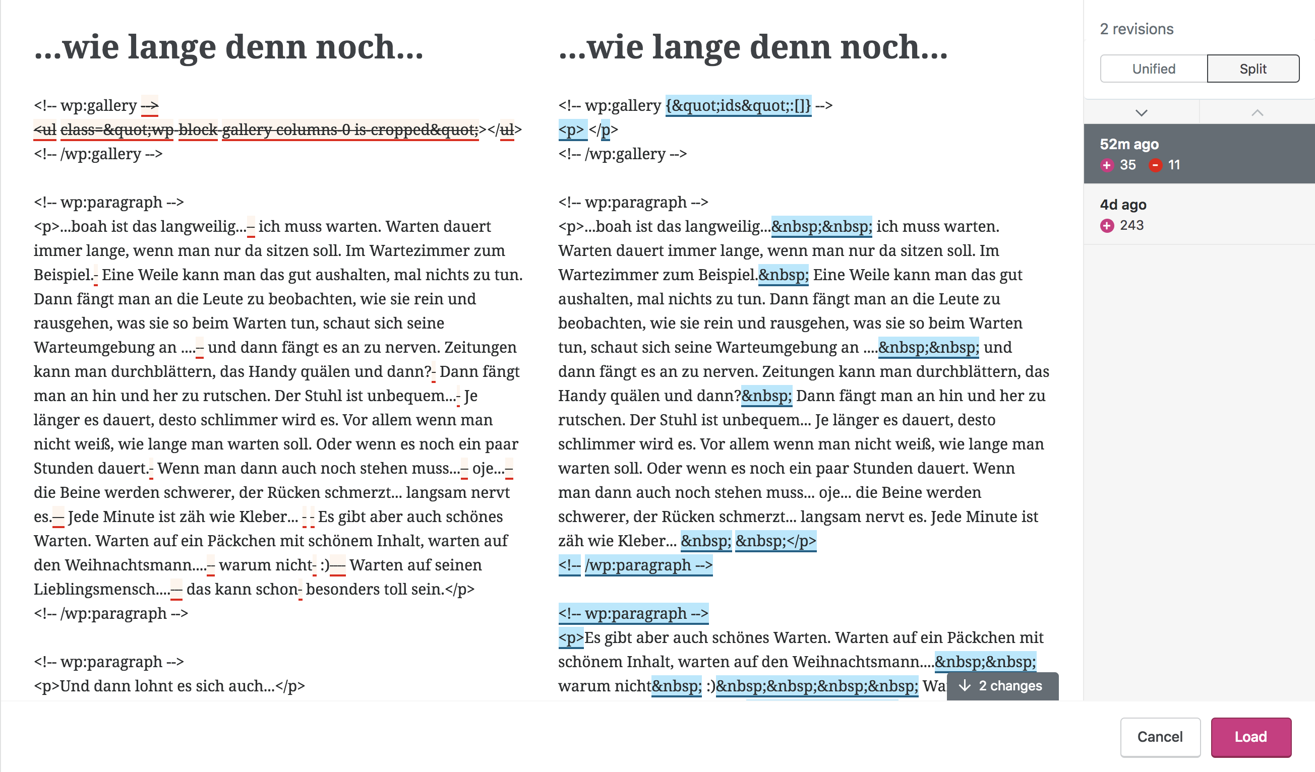 The only thing I changed was inserting a new gallery block for comparison (within the block editor), and then removing it afterwards before I SU'd out, so there should be no other changes. The broken block was there when I first entered the post, but the revision history suggested that it added itself later... which I'm really not sure what to make of, or how to fine tune each change that was made.